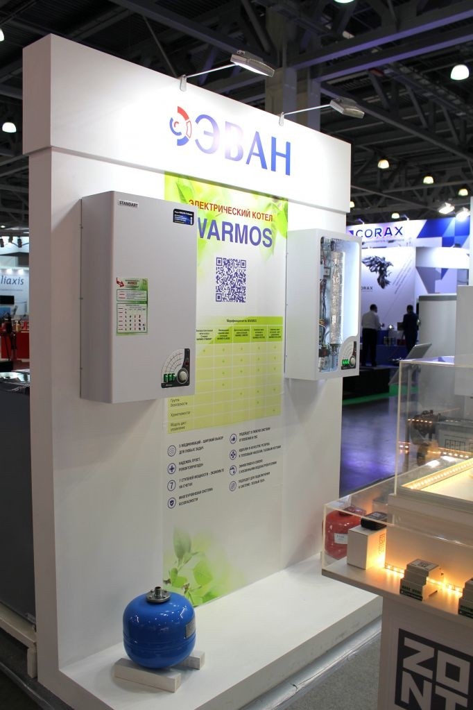 Стенд компании ЭВАН традиционно расположен в 13 зале 3-го павильона. На нем были представлены флагманские модели наших приборов во всех линейках. Водонагреватели косвенного и проточного нагрева, твердотопливные и пеллетные котлы, оборудование для промышленного применения, энергосберегающее оборудование, камины, модули дистанционного управления и, конечно же, электрические котлы.